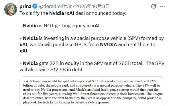 2025年10月,xAI通过特殊目的工具融资约200亿美元,英伟达直接投了20亿,这笔钱最终又回到英伟达账上买芯片。双方还一起参与BlackRock、微软发起的AI基础设施合作伙伴计划。
