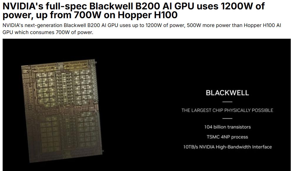 英伟达的B200 GPU,满配功耗达1200瓦,比上一代H100的700瓦又增加了71%。用于训练大模型的GB200机架,整机功耗达到120千瓦,必须依靠液冷才能运行。与之相比,一个美国普通家庭的平均用电量仅为1.2千瓦。换句话说,一个英伟达机架的耗电量相当于一百个家庭。