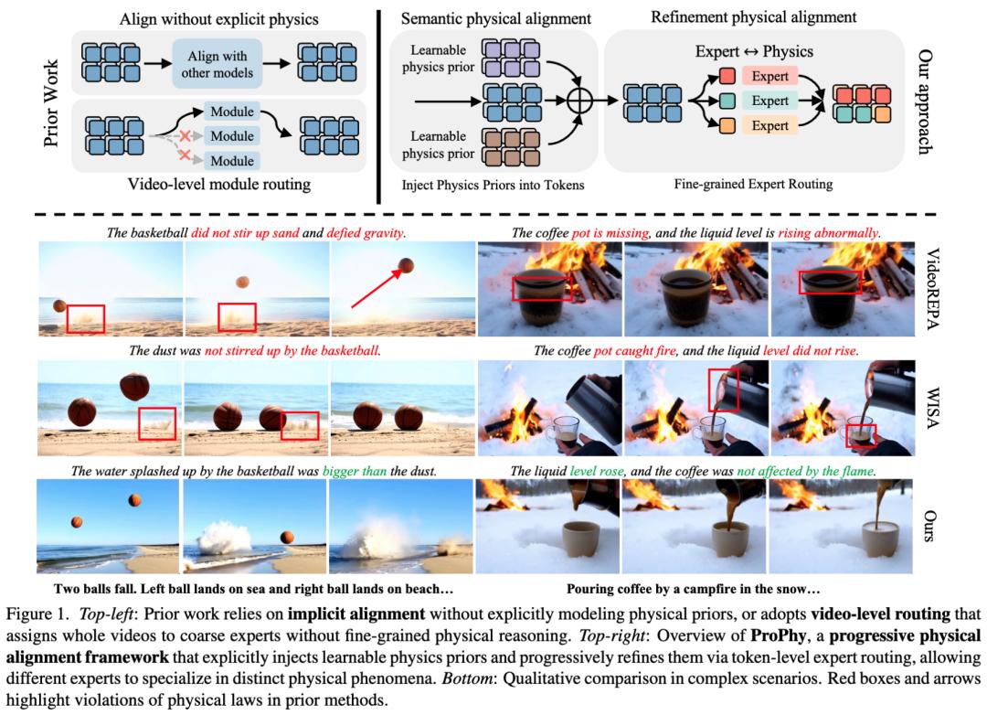 为突破这一瓶颈,中山大学和MBZUAI等机构联合提出了ProPhy。该工作构建了一种全新的渐进式物理对齐框架,使视频扩散模型首次具备“分层物理理解”与“空间物理对齐”能力——不仅能够判断应当呈现何种物理现象,更能够精准定位物理现象应发生在画面的何处。ProPhy的提出,标志着视频生成模型从“视觉逼真”迈向“物理一致”,向真正意义上的“世界模拟器”迈出了关键一步。