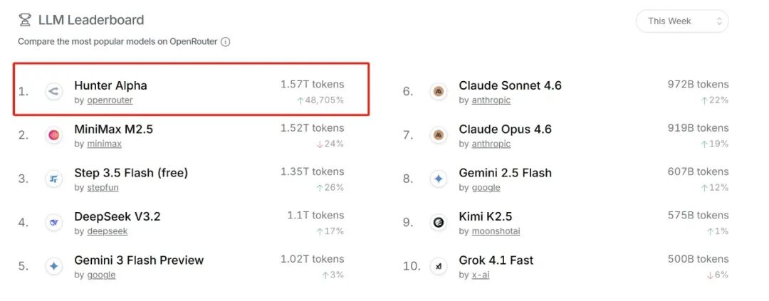 来源:OpenRouter LLM Leaderboard(2026.3.10-2026.3.16)