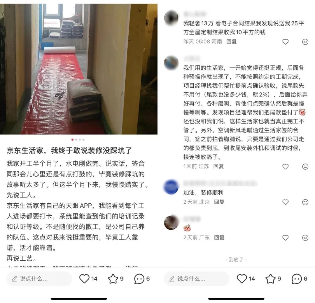 其次,要建立口碑和信任,依然任重道远。在小红书上,有用户大赞京东家装不踩雷,但也有用户装修吐槽装修质量、施工人员不负责等。京东要做好“标准化”,扭转家装行业多年以来的顽疾,恐怕非一日之功。