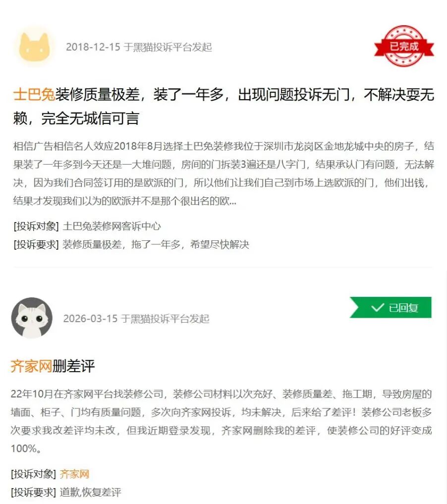 在黑猫投诉平台上搜索互联网家装平台,不少用户都留下了差评,包括装修质量差、材料以次充好、拖延工期等。