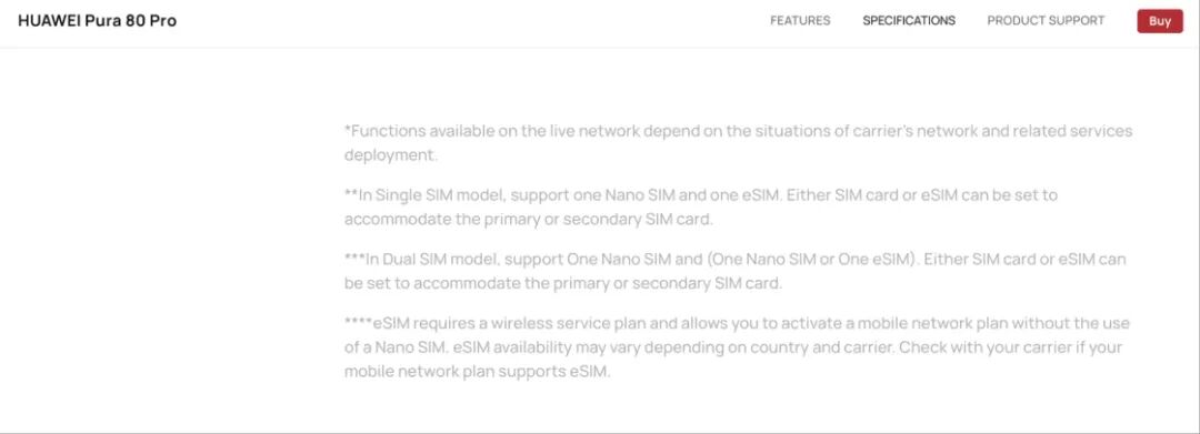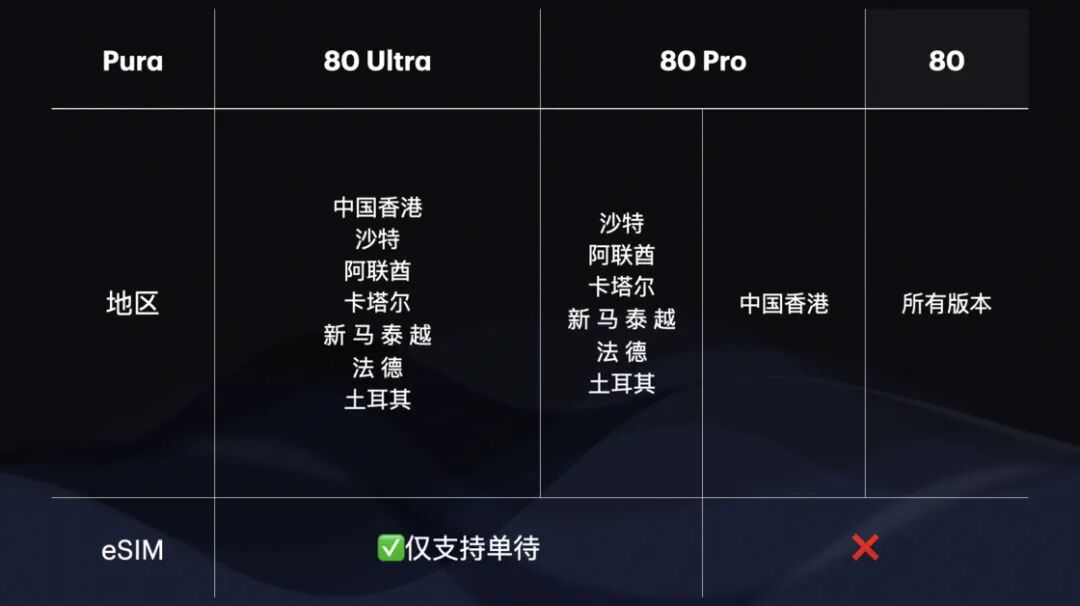 从图中可以看到基础版 Pura 80 不支持 eSIM,而在 Pura 80 Pro 和 Ultra 中除香港销售的 Pura 80 Pro 外其他版本均支持 eSIM 功能。