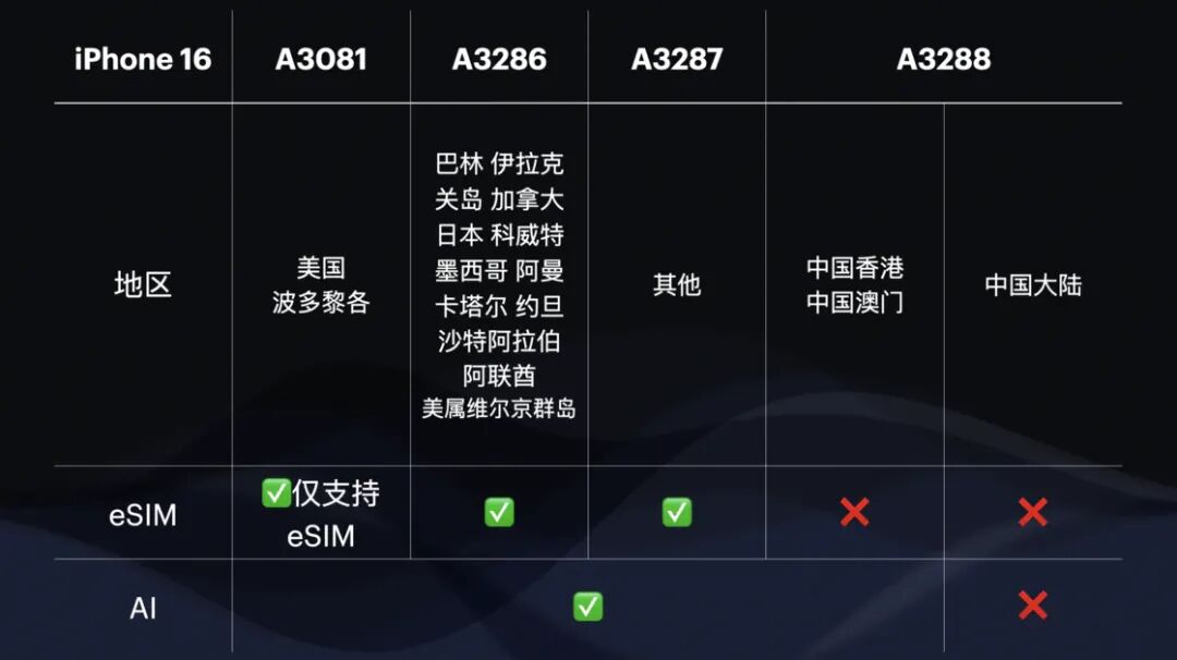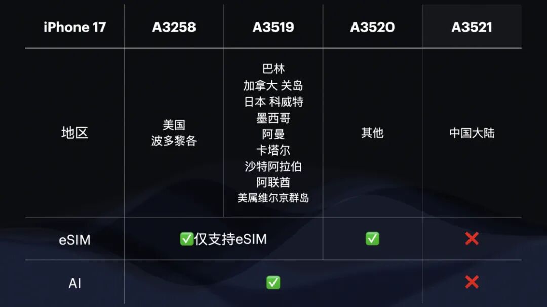 从图中可知从 iPhone 16 系列(这里所指的系列不含 iPhone 16e;系列中四款 iPhone 销售版本地区分区策略相同,故仅用 iPhone 16 展示)到 iPhone 17 系列,主要的变化在于加拿大、日本、墨西哥和中东地区部分国家以及美国海外领土销售的 iPhone 也转向纯粹的 eSIM 版本,而香港、澳门销售的 iPhone 也加入到通行的「国际版」,国行 iPhone 成为可容纳 2 张实体 SIM 卡的唯一版本选项。