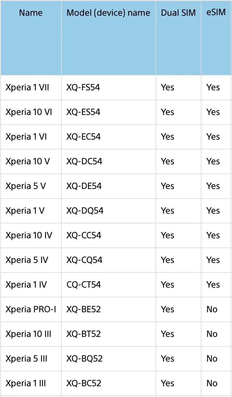 Sony 自 Xperia 1 IV、Xperia 5 IV 以及 Xperia 10 IV 引入 eSIM,仅欧洲地区销售的 Xperia(型号以数字「54」结尾,其他版本是「72」结尾)支持。Sony 的官网并未说明其 eSIM 是否支持双待,所有型号均配备双实体 SIM 卡槽。