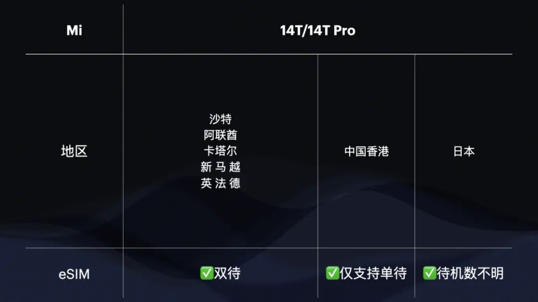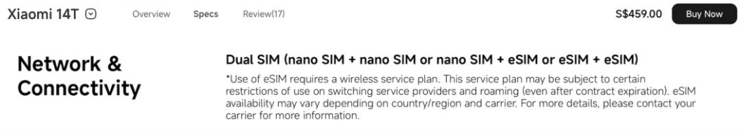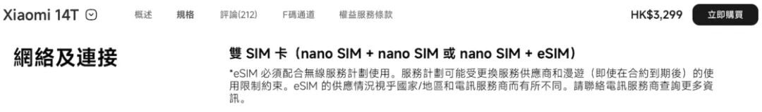 上述所有型号均支持 eSIM 功能,并且小米在几乎所有页面明确标注了支持 eSIM 双待的情况。对于 14T 和 14T Pro,香港销售的版本仅支持 eSIM 单待;其他小米和 POCO 型号与版本在提供销售的地区均支持 eSIM 双待,而更亲民定位的红米机型仅支持单待。所有机型均配备双实体 SIM 卡槽。