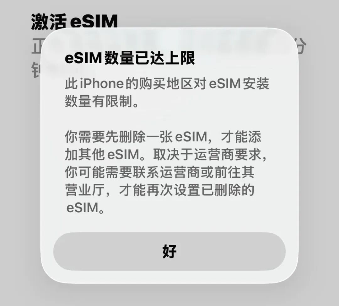 国行 iPhone eSIM 数量达到上限的提示