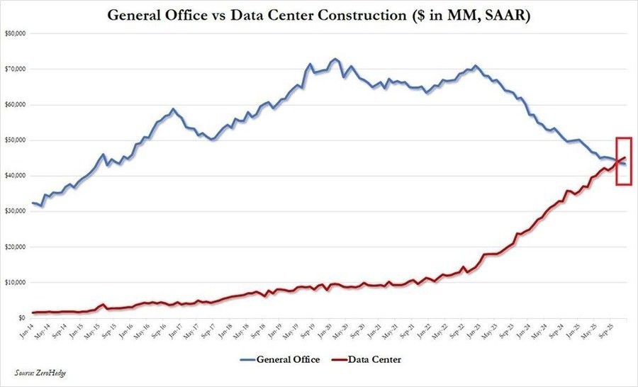 这种快速增长推动了数据中心楼宇规模历史上首次超越了传统办公楼项目。这标志着人工智能正在重塑美国经济,而美国企业利用物理空间的方式也正在发生永久性转变。