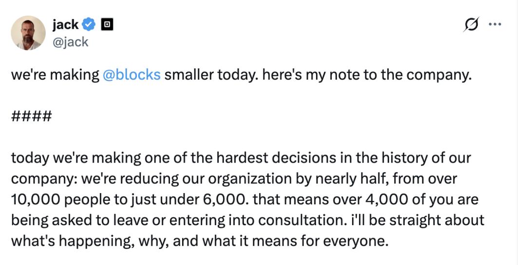 就在一个月前,美国金融科技公司Block宣布裁掉4000人(占比接近50%),理由是AI技术升级带来的工作模式变化。
