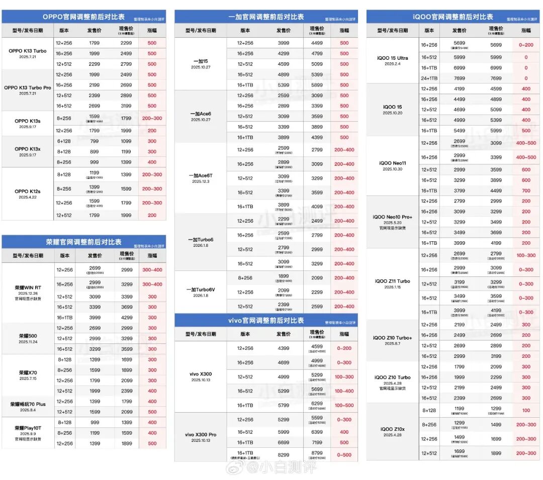 按卢伟冰提供的数据测算,目前一台12GB+256GB手机的内存价格已上涨约619元。不过对比而言,智能手机厂商并未将内存涨价的压力全部抛给消费者市场。小白测评统计的数据显示,近期多款智能手机产品价格涨幅为200元-500元。
