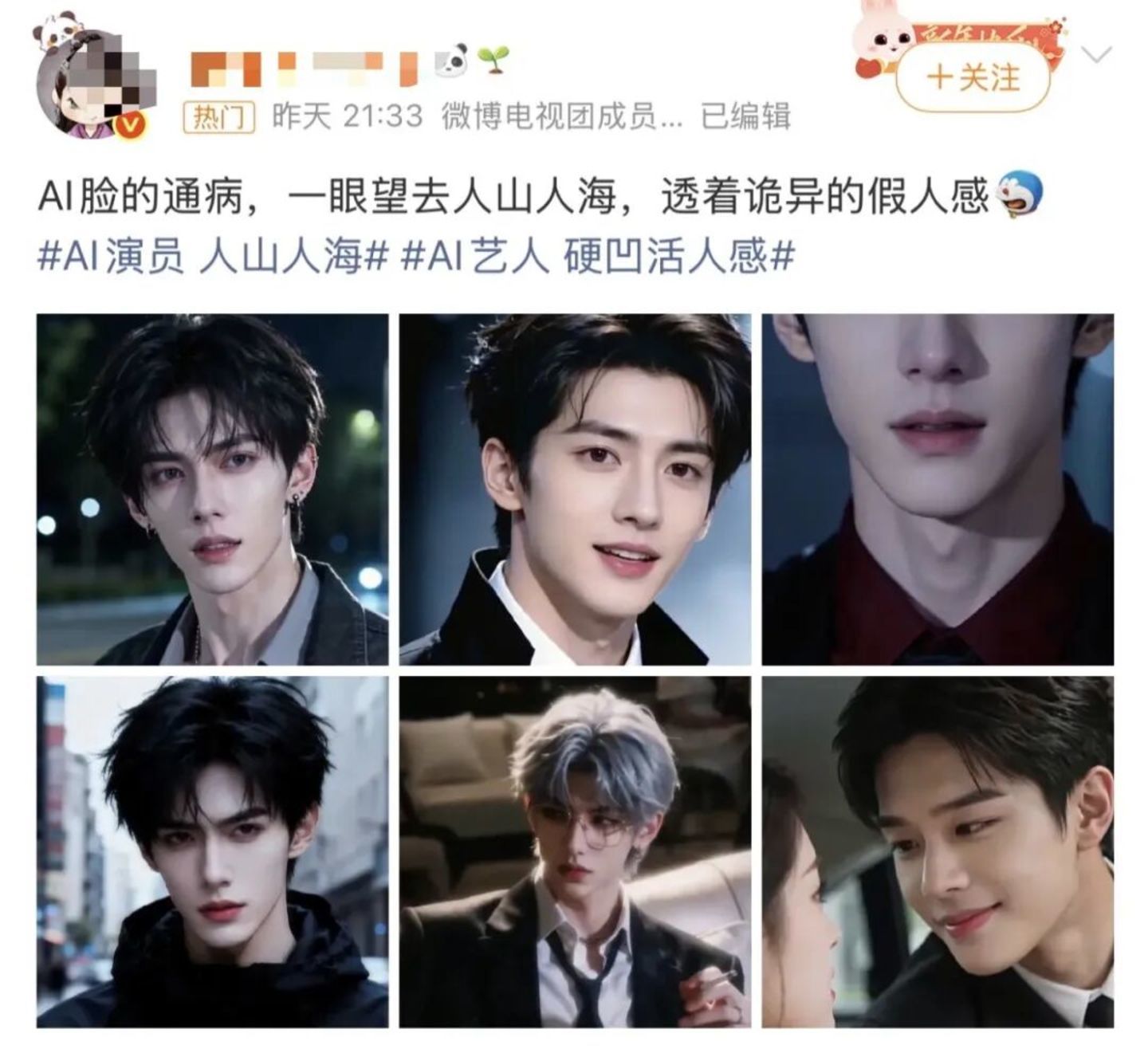 同时,#网友抵制AI演员# #AI演员 人山人海##AI演员 恐怖谷效应##AI艺人 硬凹活人感#等话题登上微博热搜,久居不下。