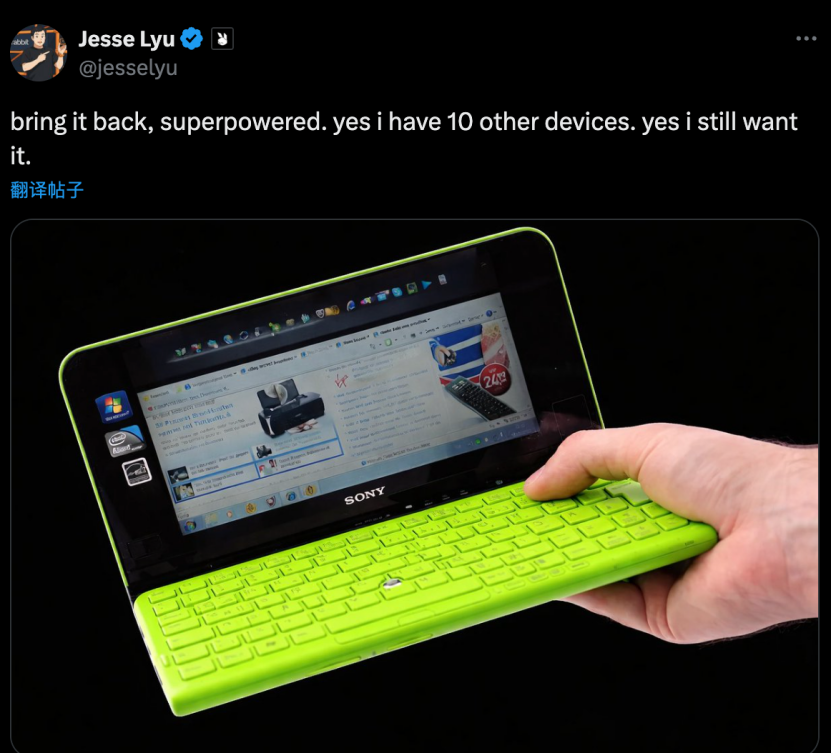 吕骋曾在社媒上发出来Cyberdeck的原型——2009年的Sony Vaio P,一款8英寸左右的超小型上网本。