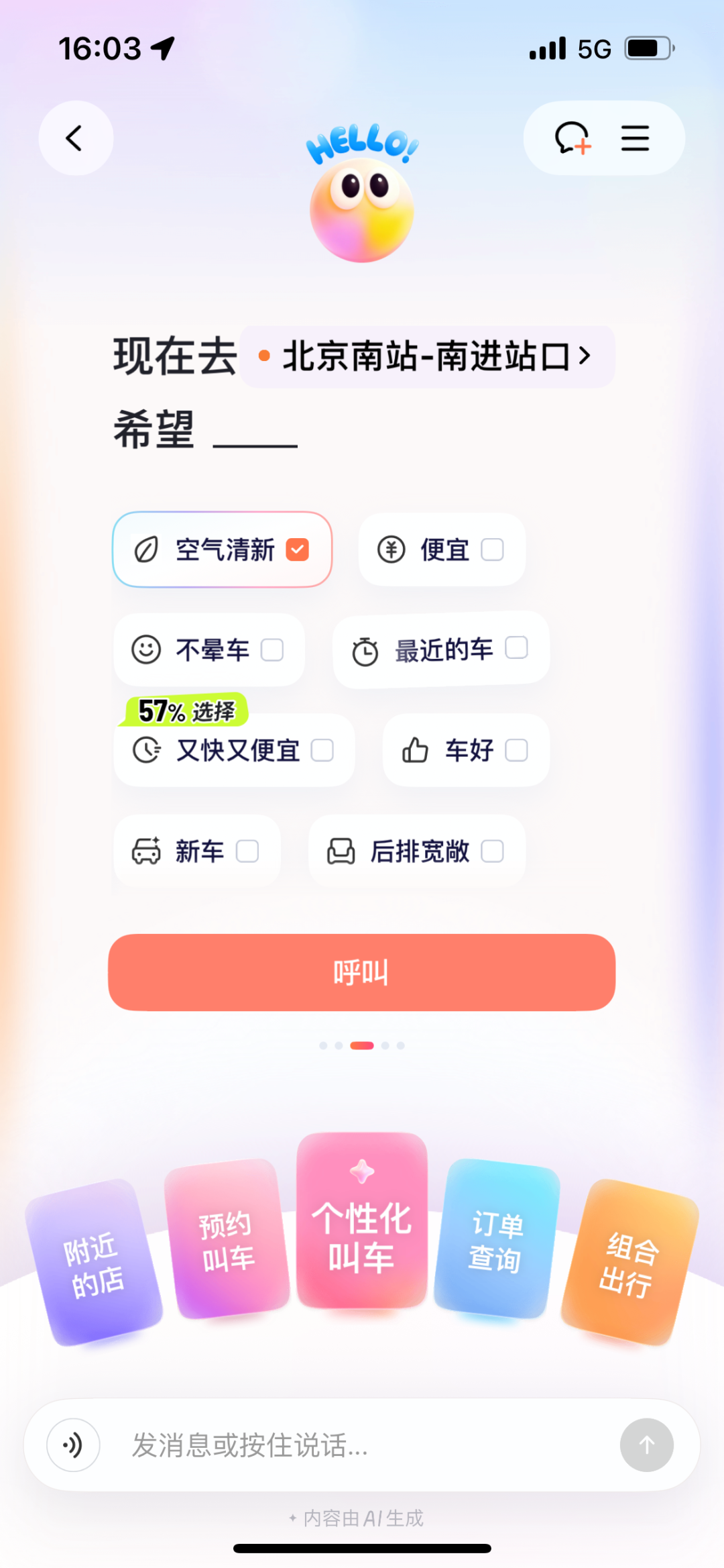 在传统的出行App里,用户想要一辆“适合孕妇乘坐的车”,需要手动筛选多个车型、翻看车主评价,最后往往还是在开盲盒。这本质上是一种选择题逻辑:平台提供有限选项,用户被动匹配。
