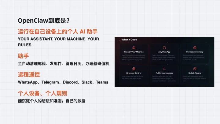 跟 Manus 这种拿来即用的不太一样,它是一个开放的智能体平台,运行在你自己的机器上,可以通过你的聊天工具去工作——WhatsApp、Telegram、Discord、Slack、Teams,国内就是飞书、QQ、微信。