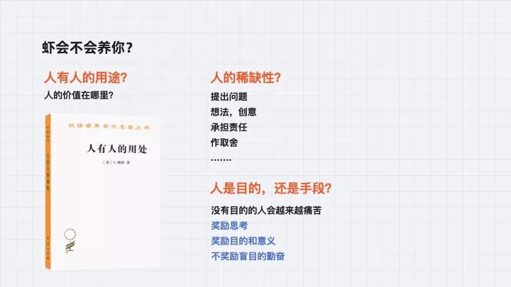 而未来 AI 时代,没有目的的人会更痛苦。因为你作为手段的那部分越来越少,作为目的的那部分越来越多。没人告诉你该做什么的时候,你能不能知道自己想做什么、要做什么?未来的 AI 时代,奖励思考、奖励目的和意义,不奖励盲目的勤奋。