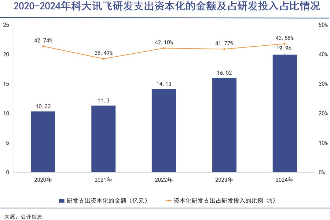 这甚至还是报表美化后的结果。长期以来,科大讯飞研发费用资本化的比例持续保持在40%左右,这样的操作也极大地缓解了利润端在纸面上的“压力”。这种处理方式可以在短期内美化利润数据,但实质是“寅吃卯粮”——资本化的研发投入需在未来数年摊销,若相关项目未能实现预期商业化收益,不仅摊销会持续拖累利润,还需计提资产减值。