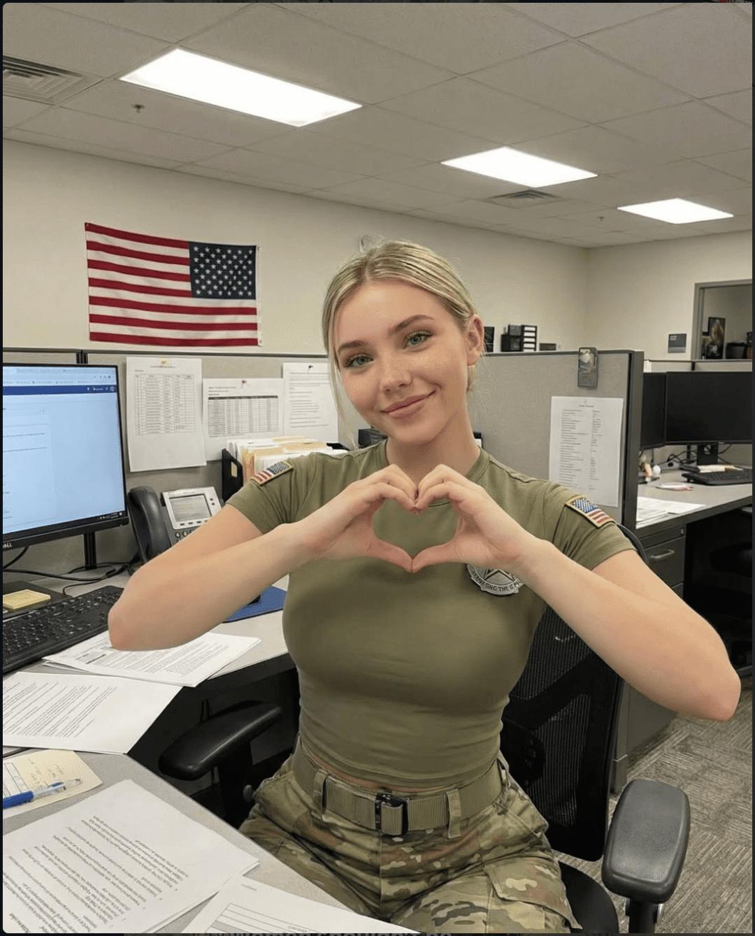 第一条帖子是一段短视频:一位蓝眼金发的年轻女兵坐在美国国旗下,穿着紧身T恤,配文赤裸裸地写道——「每一个喜欢美国女兵的直男,都来评论一下吧。」