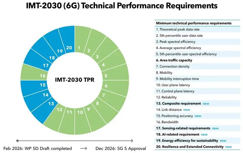 近日,国际电信联盟(ITU)宣布其下属无线电通信部门(ITU-R)5D工作组已于2026年2月通过协商一致,正式确定IMT-2030(6G)的性能要求草案。该项名为《IMT-2030无线接口技术性能最低要求》的草案共提出20项技术性能要求(TPR),其中7项为6G新增特有指标,旨在评估未来6G无线接口。