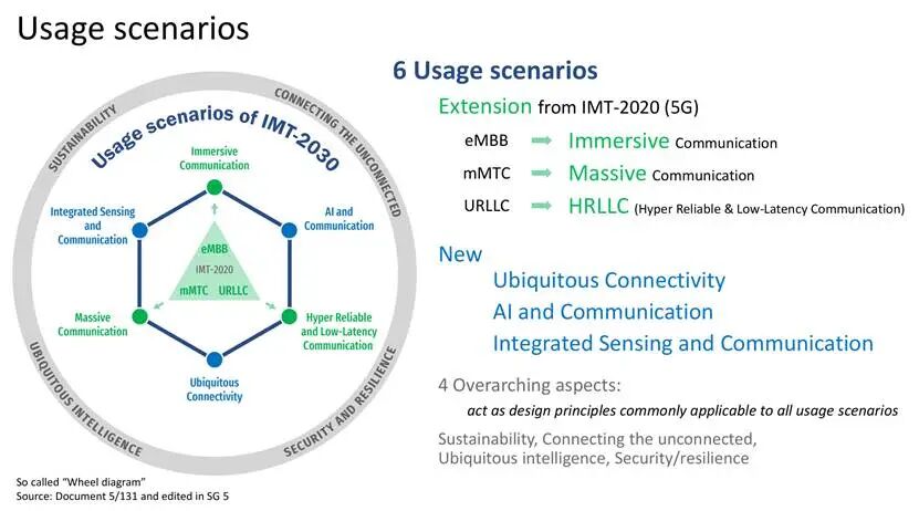 对于6G形成的20项技术性能要求,均指向六大应用场景,即沉浸式通信(IC)、超高可靠低时延通信(HRLLC)、海量通信(MC)、泛在连接(UC)、人工智能与通信融合(AIAC)以及通感一体化(ISAC)。2023年12月,ITU首次确定了6G的框架和总体目标,就确定下来了这6大场景,既有对5G的演进,又有新的场景需求。