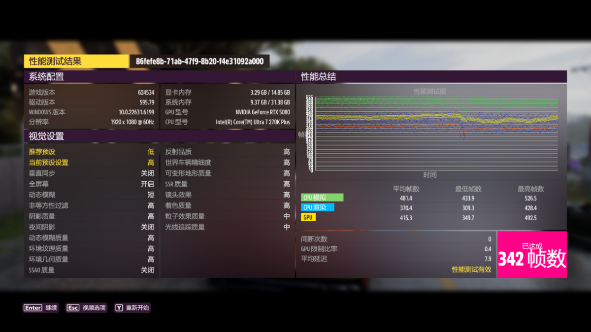 在《极限竞速:地平线 5》中,以 1080P 分辨率 + 高画质运行游戏自带基准测试: