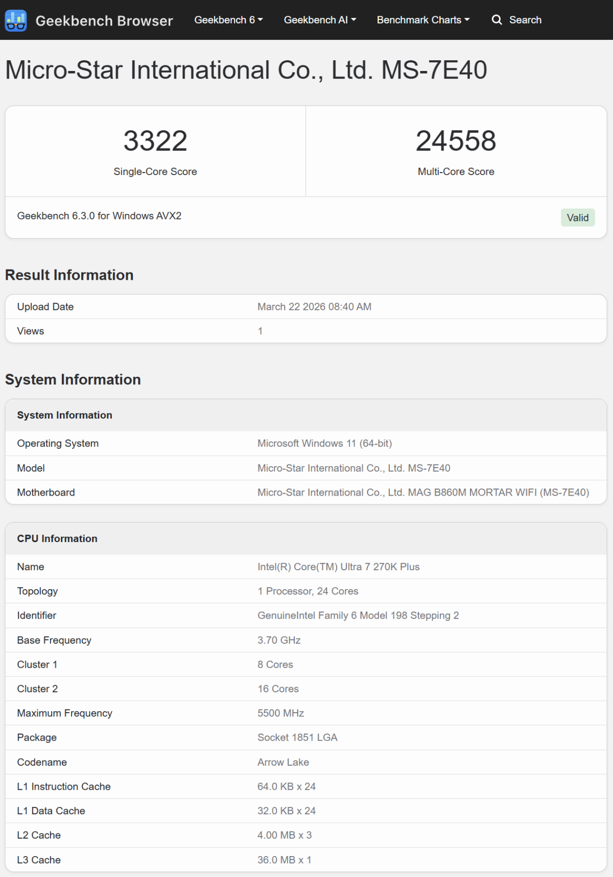 酷睿 Ultra 7 270K Plus 的单核分数为 3322 分,多核分数为 24558 分;