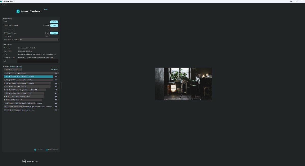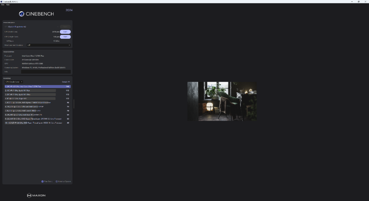 我们还顺带测试了最新推出的 CineBench 2026,酷睿 Ultra 7 270K Plus 跑出了单核 604 分,多核 10272 分的成绩。