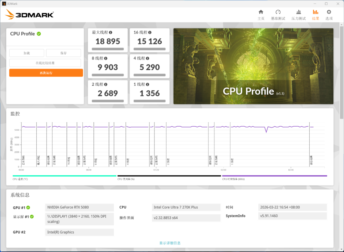 酷睿 Ultra 7 270K Plus 的最大线程分数为 18895 分,单线程分数 1365 分;