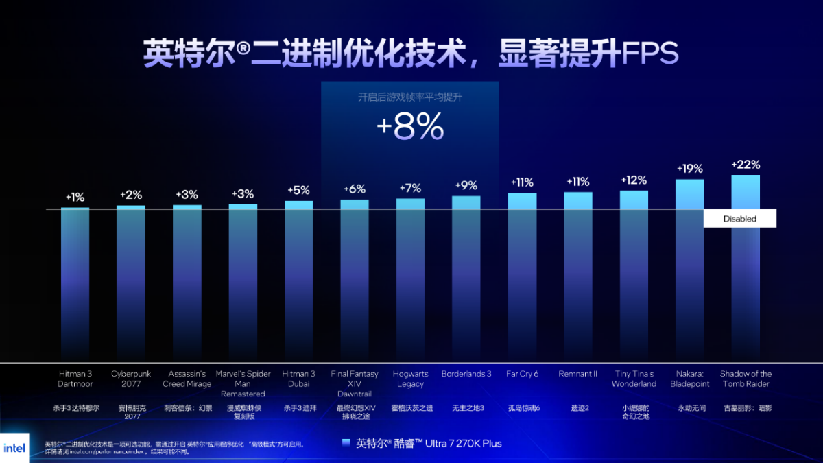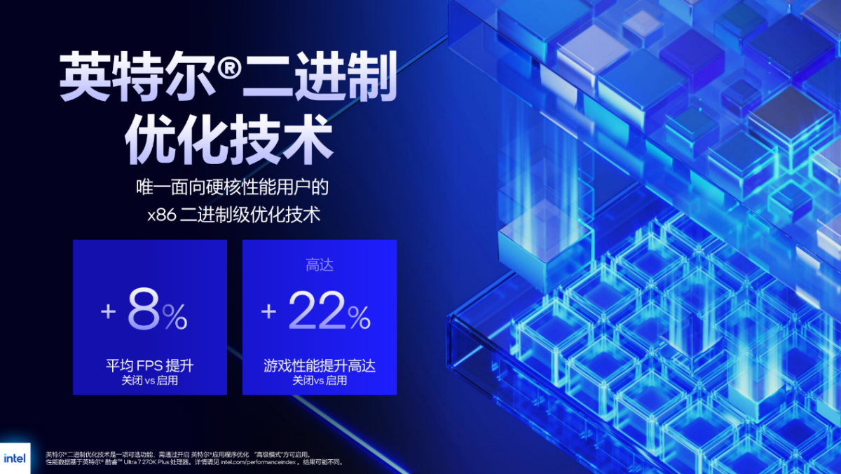 而在这次推出的酷睿 Ultra 200S Plus 系列处理器上,英特尔又为玩家朋友们带来了全新的游戏“Buff”—— 二进制优化。前面我们提到,官方表示通过该技术最高可使游戏获得 22% 的性能提升。