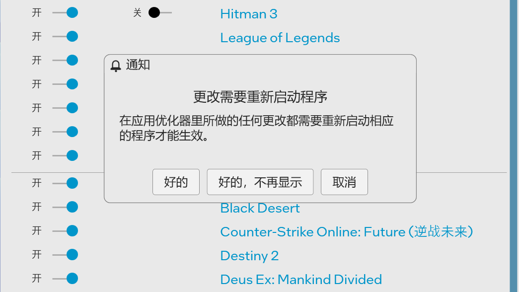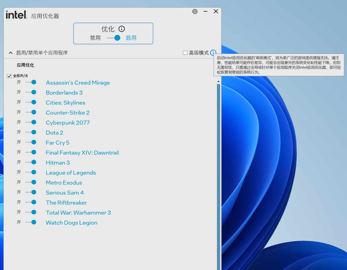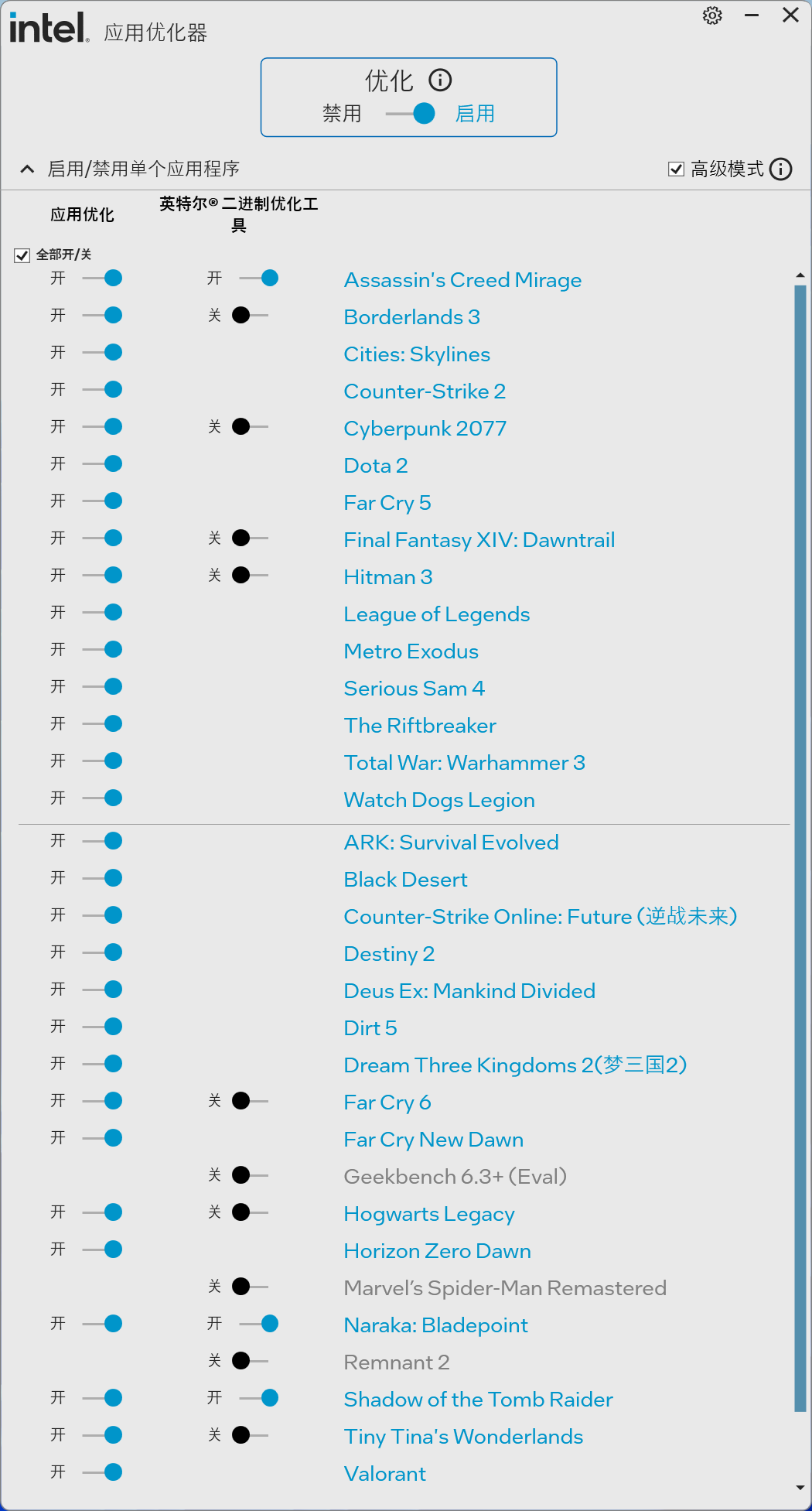 需要注意的是,二进制优化功能并不能在打开游戏的情况下即时生效,打开后必须退出游戏重新启动才能获得性能提升,关闭也是同理,建议大家在进入游戏前就设置好对应优化选项。首批支持二进制优化功能的游戏数量达到了 12 款,接下来的性能测试环节,我们将挑选其中的 3 款给大家进行开关二进制优化功能下的实际性能表现对比,BIOS 性能模式依旧以 intel Default 为基准,系统电源策略则统一设置为高性能。