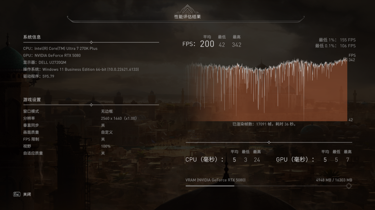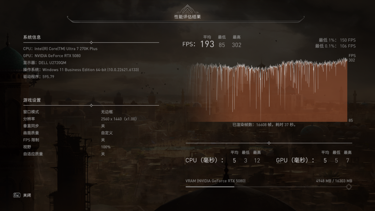 在《刺客信条:幻景》中,以 2K 分辨率 + 高画质预设,运行游戏自带基准测试: