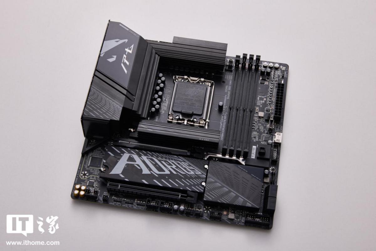 在主板的选择上,IT之家为其搭配了技嘉 Z890M AORUS ELITE WIFI7 小雕主板,外观延续工业风设计,灰黑色调搭配散热装甲上的斜线纹理与鹰头标志,辨识度拉满。装甲棱角线条兼具颜值与辨识度,品牌 LOGO 还带灯光效果。板卡采用服务器级 PCB + 2 盎司铜材质,供电区、M.2 插槽等关键区域全覆盖金属散热装甲,IO 区升级 Epic VRM 散热器,搭配 8mm 热管打造立体散热,用料扎实可靠。