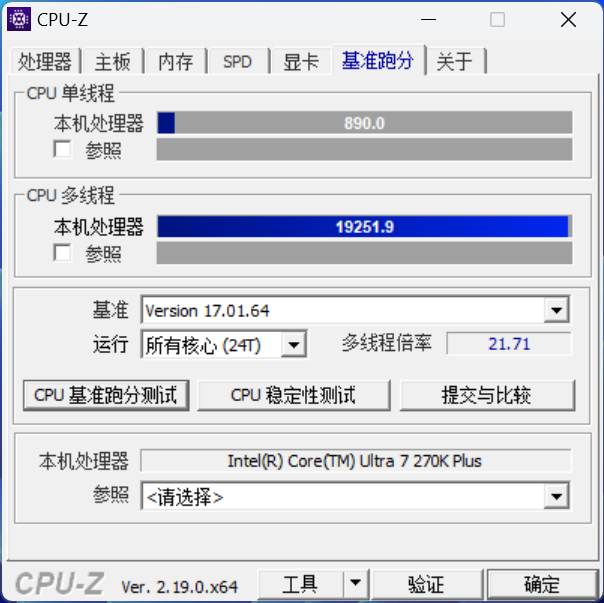 酷睿 Ultra 7 270K Plus 的单核分数为 890 分,多核分数为 19251 分;