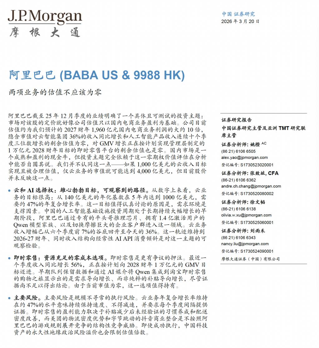但阿里跌这么多,我从头到尾听完了整个业绩会,实在算不出来是跌什么,因为阿里已经很便宜了。JP Morgan的Alex Yao发了一篇研报,我觉得很有道理:市场正在用一种极其简单粗暴的方式给阿里定价——只看电商利润,其他一切归零。现在就是买电商业务,免费送「云、AI和外卖」。