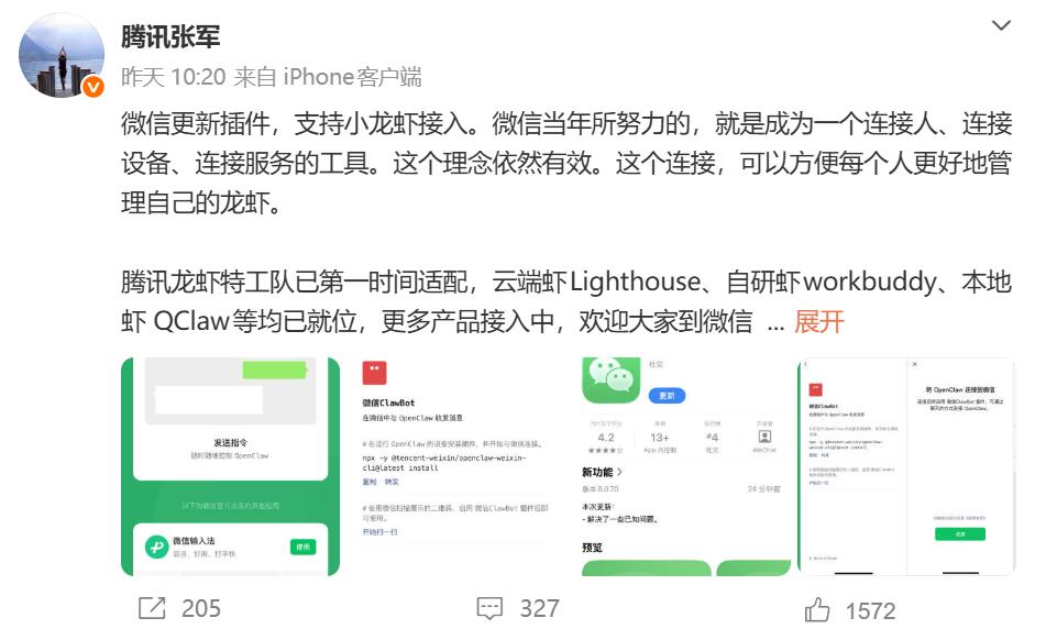 在微信不断试探Agent的同时,腾讯高层也试图通过「小龙虾」,讲述更多的AI故事。
