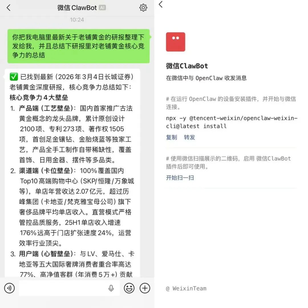 3月22日,微信低调上线了名为「ClawBot」的插件,操作方式非常简单,不需要额外配置API key,只需要打开微信的「我-设置-插件」,启动「ClawBot」,复制安装口令到OpenClaw再扫码绑定微信链接,你的「微信龙虾」就出现在对话窗口了。