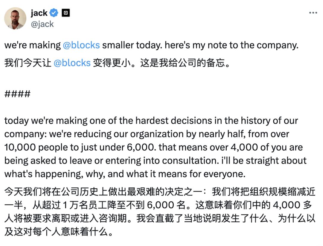 最先点燃导火索的是Block。2月26日,Block创始人Jack Dorsey宣布裁员4000人,直接砍掉公司近一半的员工。