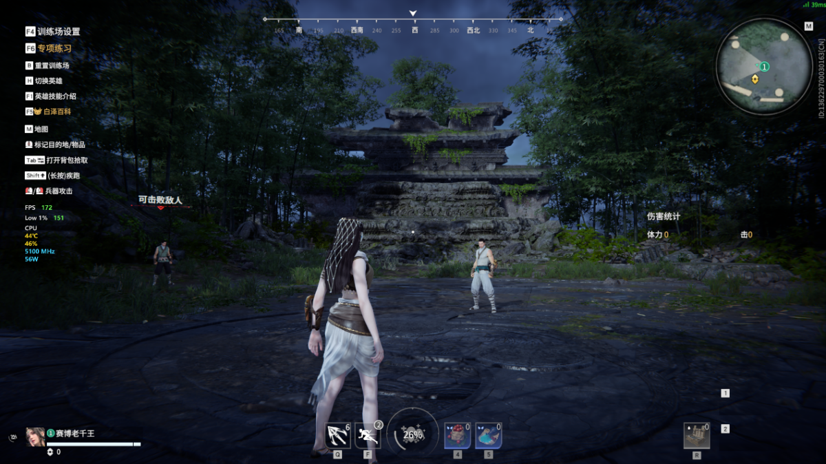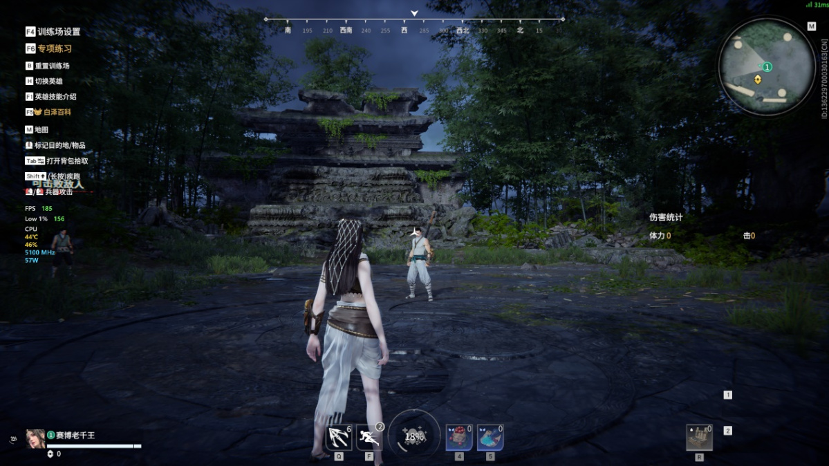 在《永劫无间》中,以 DX11 模式 + 2K 分辨率 + 高画质预设,进入训练场将人物站位在同一角度做实时帧数对比: