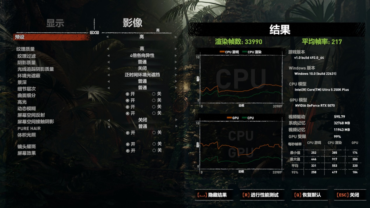 在《古墓丽影:暗影》中,以 DX12 模式 + 2K 分辨率 + 高画质预设,运行游戏自带基准测试: