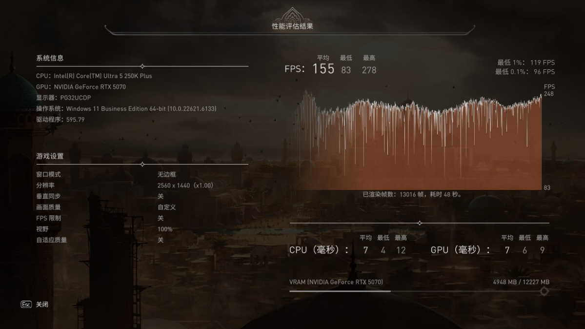 在《刺客信条:幻景》中,以 2K 分辨率 + 高画质预设,运行游戏自带基准测试: