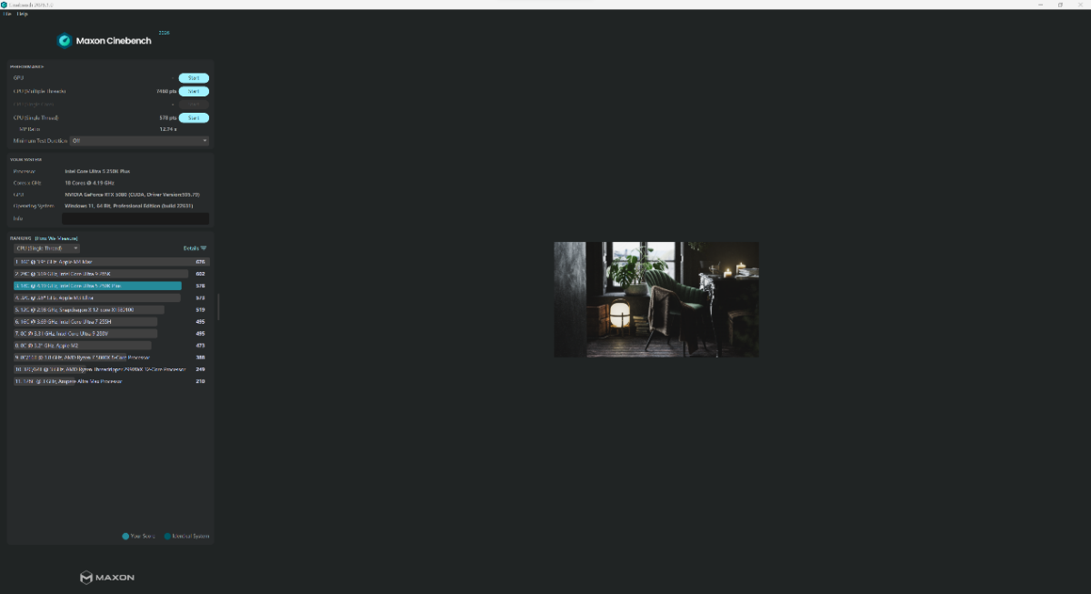 我们还顺带测试了最新推出的 CineBench 2026,酷睿 Ultra 5 250K Plus 跑出了单核 578 分,多核 7460 分的成绩。