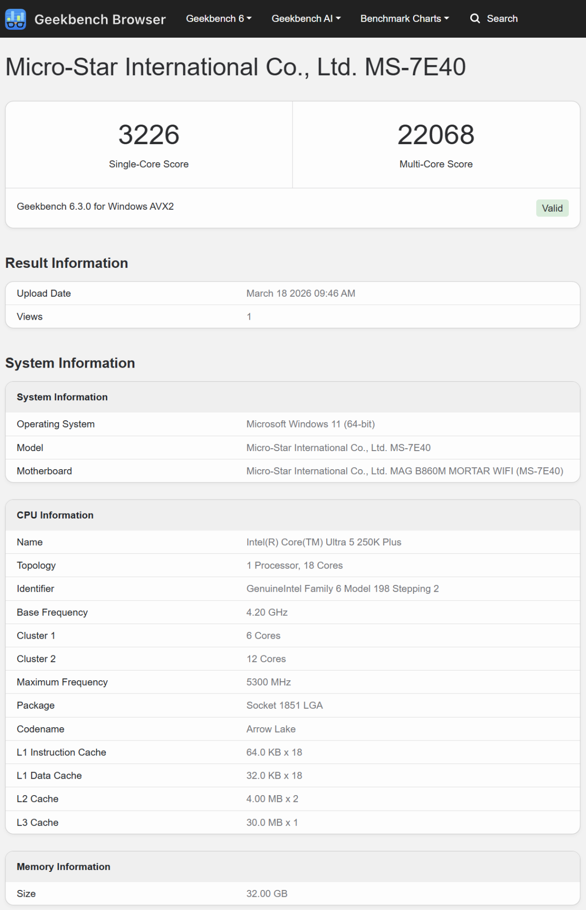 酷睿 Ultra 5 250K Plus 的单核分数为 3226 分,多核分数为 22068 分;