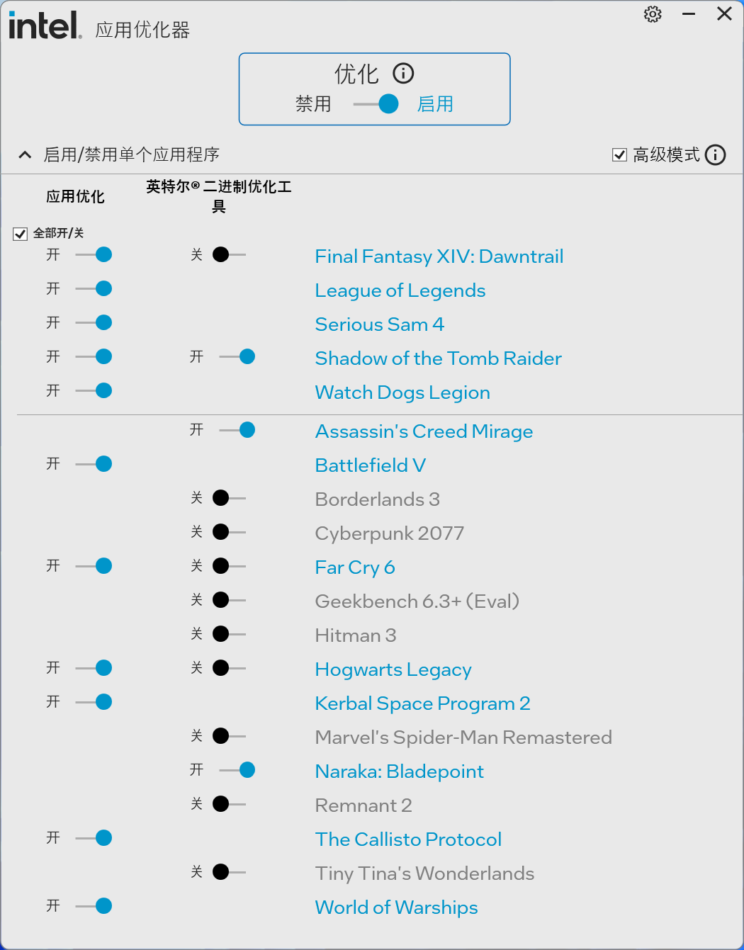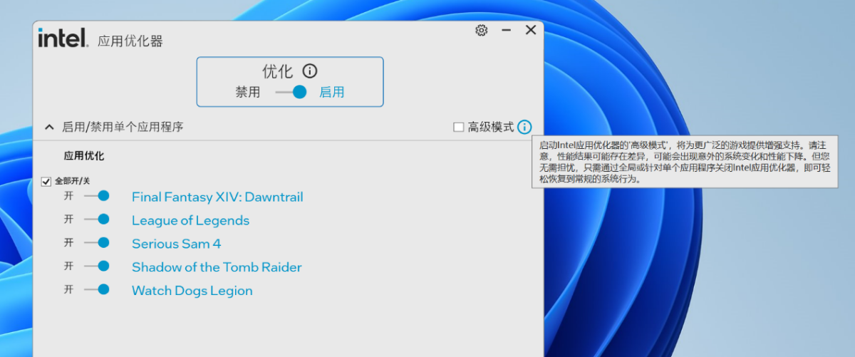 现在我们打开 APO,软件右侧会多出一个高级模式选项,在未勾选的情况下通常会默认提供 APO 性能加速。