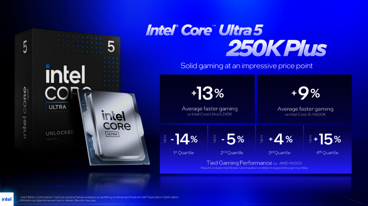 官方表示,酷睿 Ultra 5 250K Plus 处理器的游戏性能相比酷睿 Ultra 5 245K 处理器平均提升幅度达到了 13%,相比酷睿 i5-14600K 处理器的平均提升幅度达到了 9%。