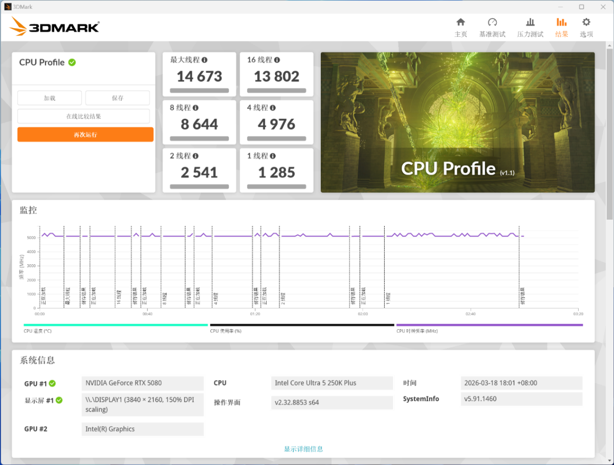 酷睿 Ultra 5 250K Plus 的最大线程分数为 14673 分,单线程分数 1285 分;