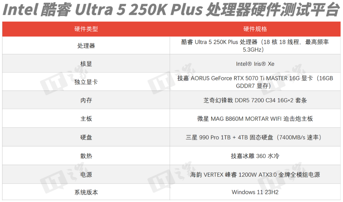 为了更好地展现酷睿 Ultra 5 250K Plus 处理器的性能,我们的测试平台会尽量贴合主流硬件搭配。另外需要注意的是,本次评测我们基于 Windows 11 23H2 系统版本进行,相比最新的 25H2 系统在性能上可能会存在一些差异,测试结果仅供大家参考。