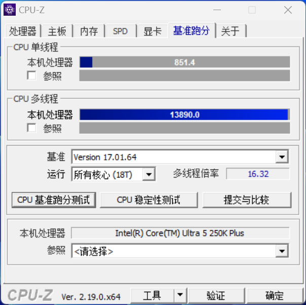 酷睿 Ultra 5 250K Plus 的单核分数为 851.4 分,多核分数为 13890 分;