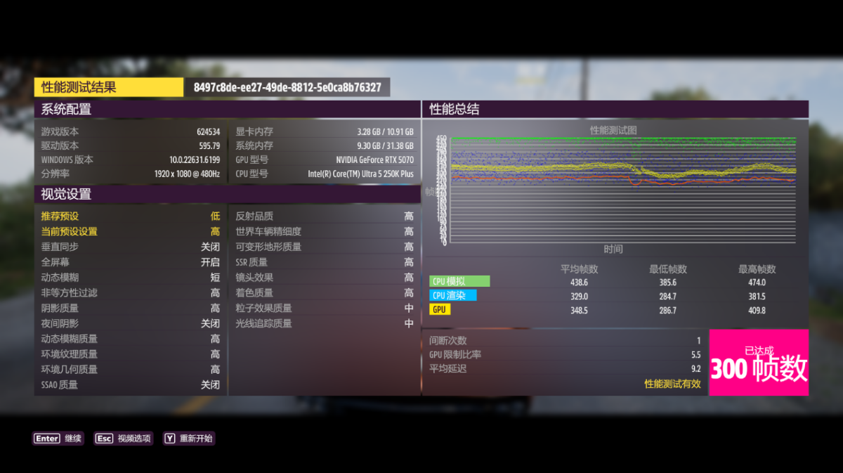 在《极限竞速:地平线 5》中,以 1080P 分辨率 + 高画质运行游戏自带基准测试,酷睿 Ultra 5 250K Plus 的游戏平均帧数为 300 帧,1% Low 帧 161 帧。