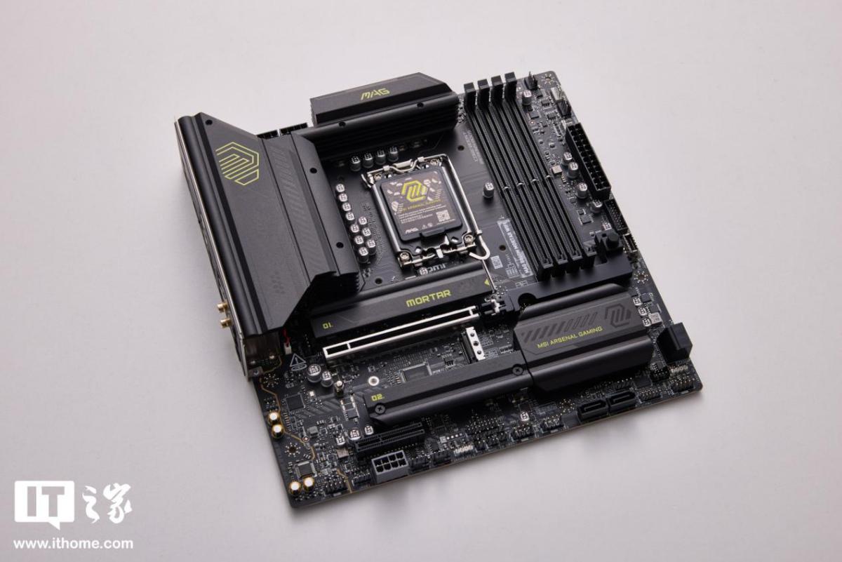 在主板的选择上,IT之家这次选择了来自微星的 MAG B860M MORTAR WIFI 迫击炮主板,这款 MATX 主板延续了迫击炮系列经典的硬核军事风设计,哑光黑装甲搭配军绿色涂装,颇有迷彩感觉,多处迫击炮标志让主板的辨识度拉满,供电区、M.2 插槽全覆盖冰霜散热装甲,搭配 7W/mK 导热垫,散热与颜值兼备。