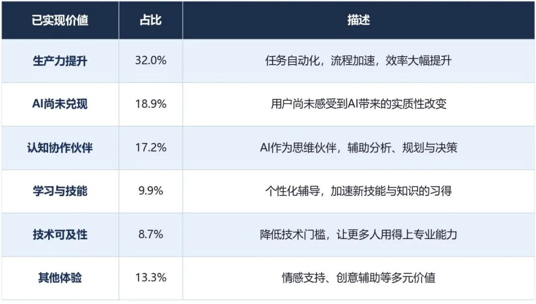•【已兑现】81%的人说AI已实现了他们的愿景;最主要的收益是生产力提升(32%),但也有近两成人表示尚未感受到实质改变;