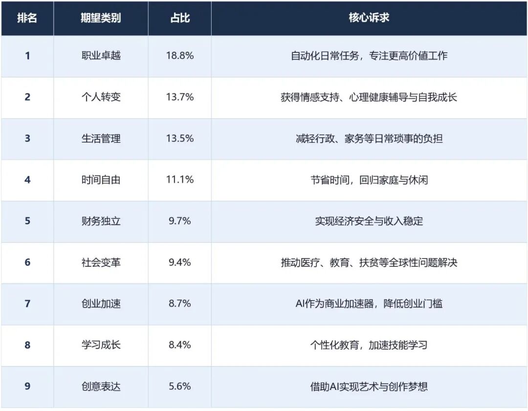 答案被归纳为九大愿景。读完这份清单,你会发现一个共同的底层逻辑:人们想要的,大多聚焦于个人与家庭层面的改善,而非AI技术本身的推进。